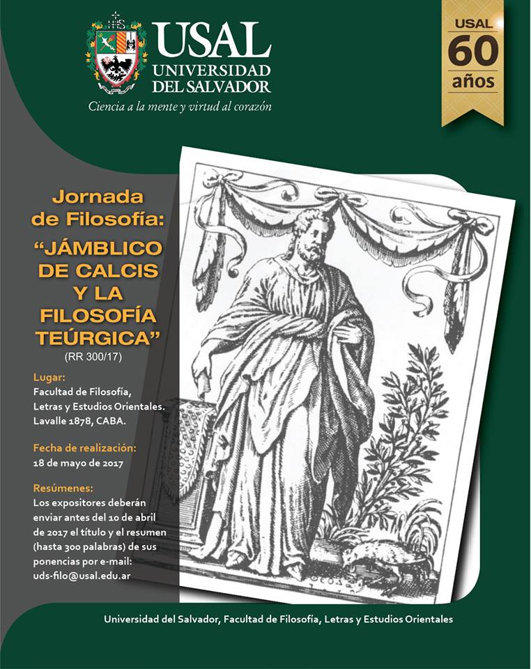 La jornadaJámblico de Calcis y la filosofía teúrgica” tendrá lugar el día 18 de mayo de 2017, a las 9.30 hs., en el Aula Magna (Lavalle 1878, CABA).